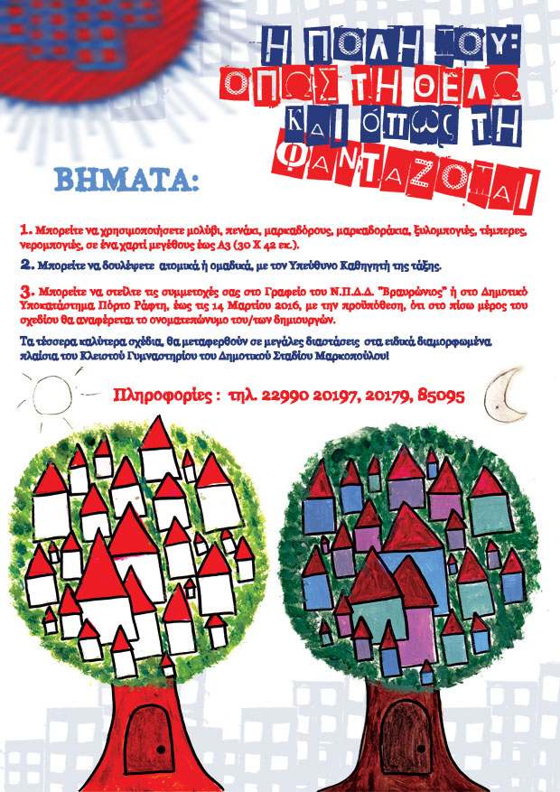 Με αφορμή την ανάπλαση του χώρου του Κλειστού Γυμναστηρίου του Δημοτικού Σταδίου Μαρκοπούλου, ο Δήμος Μαρκοπούλου και το Ν.Π.Δ.Δ. «Βραυρώνιος» προκηρύσσουν Διαγωνισμό Σχεδίου – Εικονογράφησης με τίτλο: «Η Πόλη μου! Όπως τη θέλω και όπως τη φαντάζομαι!», για τους μαθητές Γυμνασίου και Λυκείου του Δήμου, με στόχο τα τέσσερα (4) καλύτερα σχέδια, να ζωγραφιστούν σε μεγάλες διαστάσεις στους τοίχους του Κλειστού Γυμναστηρίου.