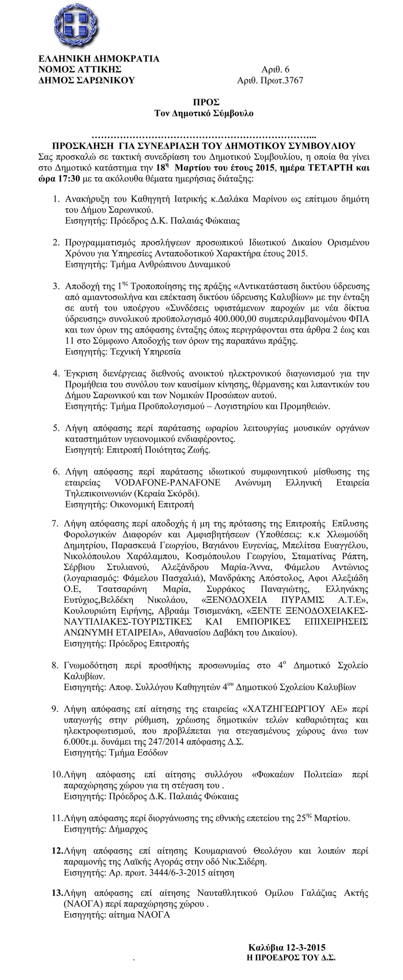 Το παρόν διαδικτυακό μέσο ουδεμία ευθύνη εκ του νόμου φέρει περί των επωνύμων ή ανωνύμων σχολίων που φιλοξενεί. Σε περίπτωση που θεωρείτε πως θίγεστε από κάποιο εξ αυτών, επικοινωνήστε μέσω της φόρμας επικοινωνίας έτσι ώστε να αφαιρεθεί.Πρόσκληση Συνεδρίασης Δημοτικού Συμβουλίου Σαρωνικού της 18/3/2015